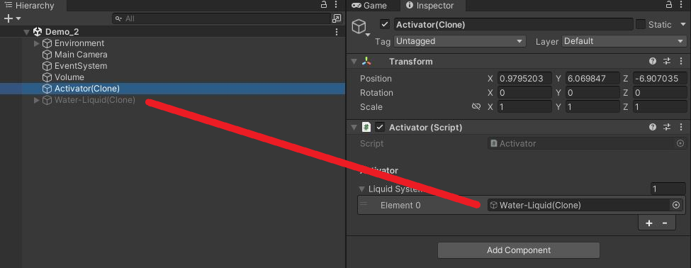 Add the Liquid System(s) to the Activator Clone by creating a new element.